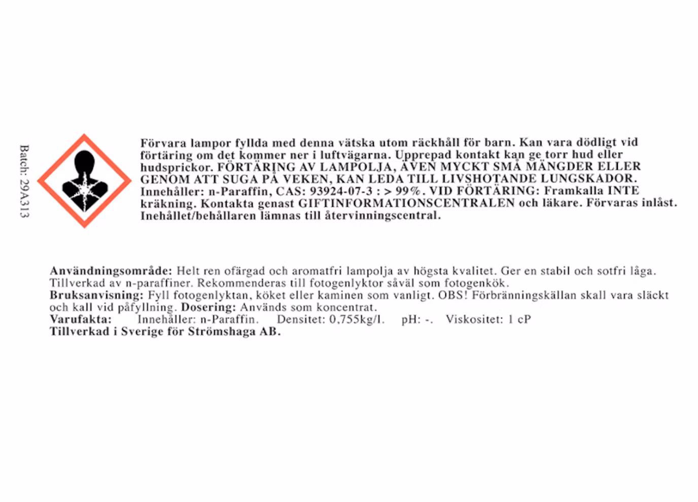 Strömshagas egna lampolja av riktigt fin kvalitet! Ren, ofärgad lampolja som ger en stabil och fin låga. Tillverkad av n-paraffiner.