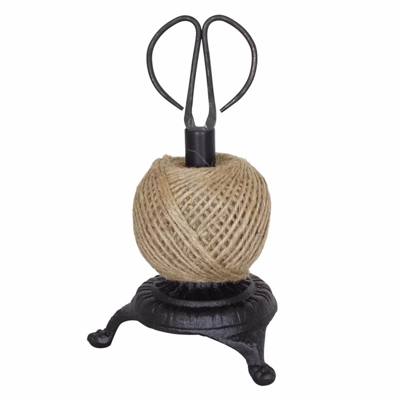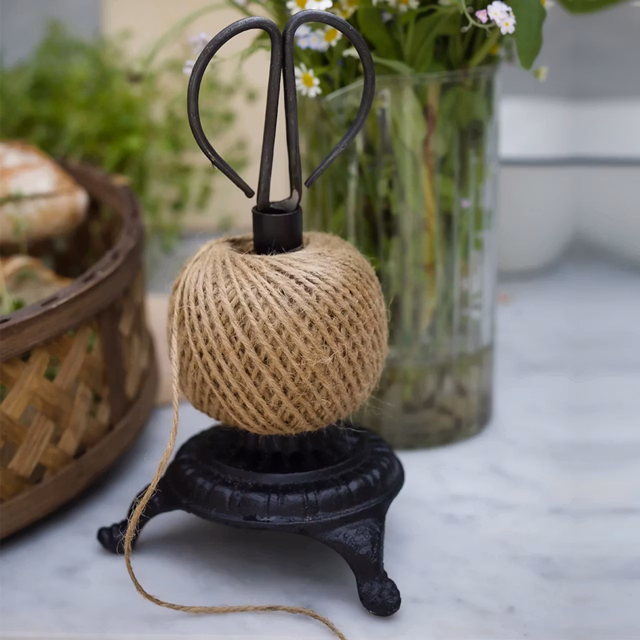 En dekorativ snörhållare i gjutjärn inklusive jutesnöre och en liten sax.