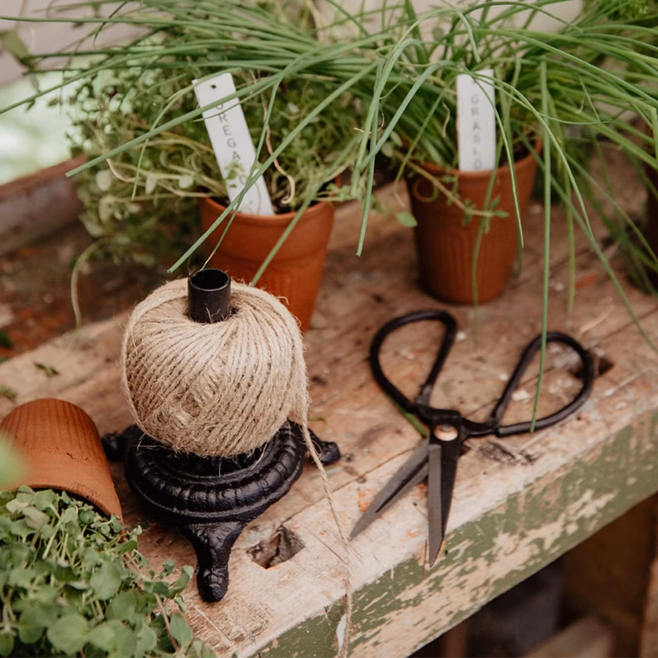Vacker inredningsdetalj som också blir en hjälpreda i trädgården eller vid bordet för paketinslagningen.