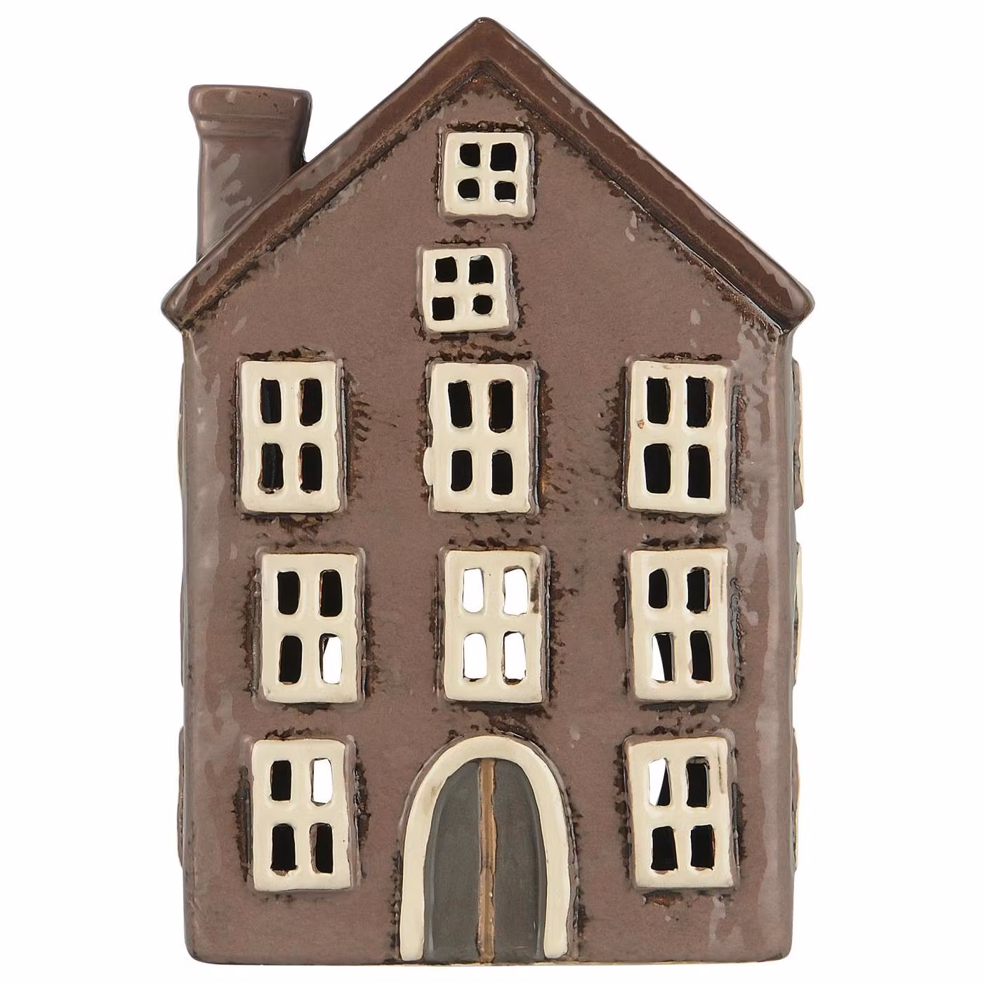 Lila laserat keramikhus för värmeljus, med inspirationfrån dom vackra kanalhusen i Nyhavn.